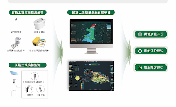 在土地平整、農(nóng)田整治的基礎(chǔ)上,利用耕地質(zhì)量監(jiān)測(cè)智能化裝備與土壤傳感器體系采集土壤理化相關(guān)指標(biāo)、土壤含水量、區(qū)域農(nóng)業(yè)氣象等數(shù)據(jù),實(shí)現(xiàn)田間地情、肥情、環(huán)情、墑情的監(jiān)測(cè)分析。聯(lián)動(dòng)應(yīng)用區(qū)域土壤質(zhì)量跟蹤管理平臺(tái),為耕地監(jiān)管單位建立數(shù)字化管理體系,實(shí)現(xiàn)高標(biāo)農(nóng)田耕地質(zhì)量的長(zhǎng)效化、動(dòng)態(tài)化、智能化監(jiān)測(cè)與管理。