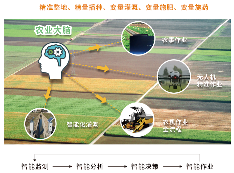 以北斗衛(wèi)星導航技術為基礎,結合智能農事建議,聯(lián)動智能裝備,實現大田生產全程作業(yè)機械化、管理可視化,農場無人化。