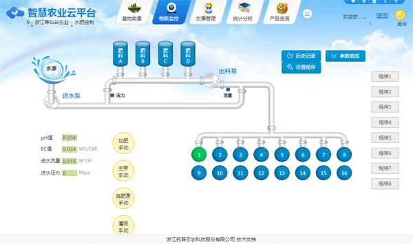 托普云農(nóng)為壽仙谷源口基地建設(shè)的水肥一體化智能監(jiān)控系統(tǒng)主要涵蓋施肥機(jī)系統(tǒng)、過濾系統(tǒng)、前端灌水器系統(tǒng)、遠(yuǎn)端控制灌溉系統(tǒng)(包括手機(jī)APP和電腦PC端)。