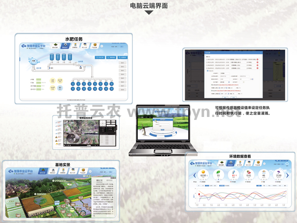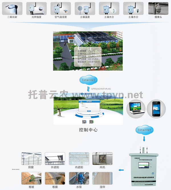 基地安裝的托普云農(nóng)的溫室小管家、空氣溫濕度、光照強(qiáng)度、二氧化碳、土壤溫濕度、智能水肥裝置、視頻監(jiān)控系統(tǒng)等智能硬件可遠(yuǎn)程在線實(shí)時采集溫室環(huán)境信息,上傳至托普智慧農(nóng)業(yè)云平臺,在管理平臺設(shè)置環(huán)境上下限值即可實(shí)現(xiàn)預(yù)警,定制的托普智慧農(nóng)業(yè)管理平臺通過手機(jī)或電腦可遠(yuǎn)程自動開啟相關(guān)的通風(fēng)、濕簾、灌溉等設(shè)備,查看環(huán)境數(shù)據(jù)、視頻信息、遠(yuǎn)程進(jìn)行專家咨詢、查看作物生長情況、設(shè)備運(yùn)行狀況、園區(qū)安防情況等。實(shí)現(xiàn)溫室大棚的信息化、智能化、簡約化管理。真正做到手機(jī)、電腦在手,管理無憂。