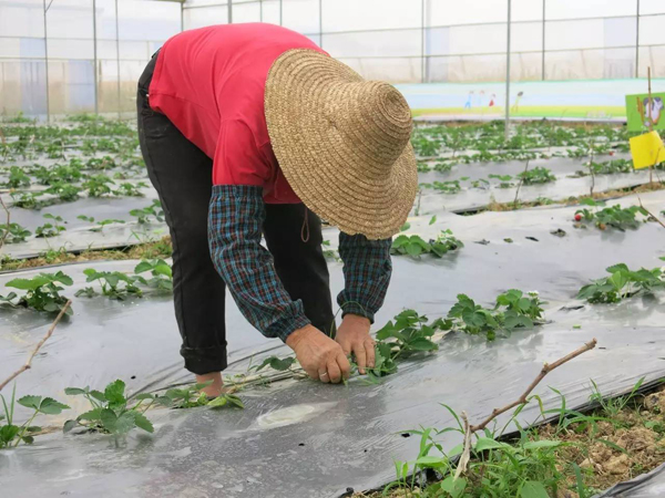 草莓苗木定植到長出花蕾后,逐株人工摘除過多老葉及子芽、腋芽;開花結(jié)果后再次摘除莖部變黃的老葉、枯葉,及時摘除匍匐莖,減少營養(yǎng)消耗,同時除去小分枝及弱小果,提高品質(zhì)。