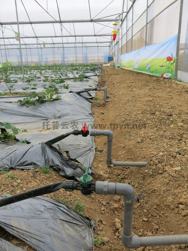 進入二次結(jié)果后,一些草莓出現(xiàn)脫肥現(xiàn)象。此時如果不加強養(yǎng)分供應,容易影響到二茬果的產(chǎn)量和品質(zhì)。而且花期又不適宜經(jīng)常噴施葉面施肥,為施肥增加了一定的難度。運用托普云農(nóng)水肥一體化滴灌技術(shù),將相應階段的有機肥溶于水中配成溶液,通過埋在土壤下的管道施肥,并在大棚內(nèi)施放二氧化碳氣肥,有效提高光合作用,及時補充草莓所需的大量多元微量元素。