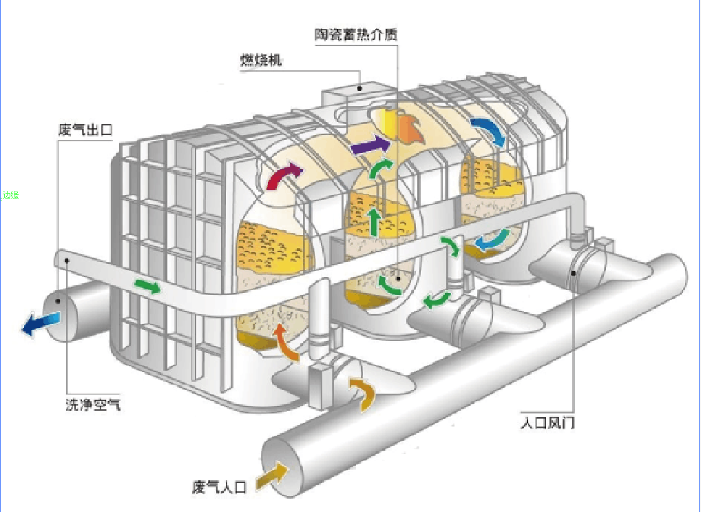 底盤整體噴漆線廢氣濃縮焚燒系統(tǒng)RTO的核心是氧化室和蓄熱室,分別提供氧化反應(yīng)所需要的反應(yīng)時間和溫度條件,RTO設(shè)備主要由上室體、下室體、風(fēng)閥、加熱系統(tǒng)、風(fēng)機、超溫泄放裝置等組成。利用陶瓷熱交換填料的熱特性快速吸收熱氣(燃燒處理后的凈化氣)的熱量,用于冷氣的升溫,填料交替性地分別與熱氣或冷氣相互接觸,降低燃料的消耗量,節(jié)約能源。RTO設(shè)備共有3個蓄熱室,在下室體通過切換閥的動作,使上室體3個蓄熱室輪流處于進氣放熱、吹掃凈化、排氣蓄熱狀態(tài),循環(huán)往復(fù),連續(xù)工作。