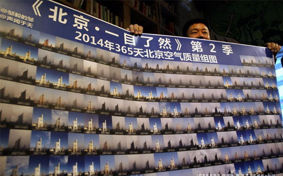 ??????? 鄒毅每天拍攝同一場景一張,組圖365張,讓大家一目了然看到北京的365天的天氣情況,呼吁公眾保護(hù)環(huán)境。這是他連續(xù)第二年以同樣方式記錄北京的天氣狀況。市民用手機(jī)拍下鄒毅的《北京·一目了然》第2季。