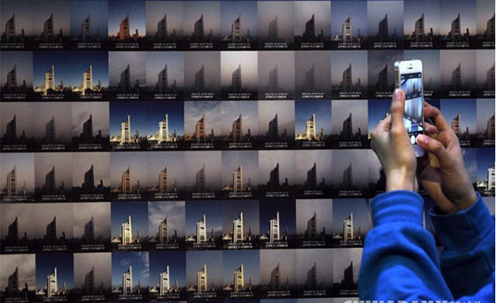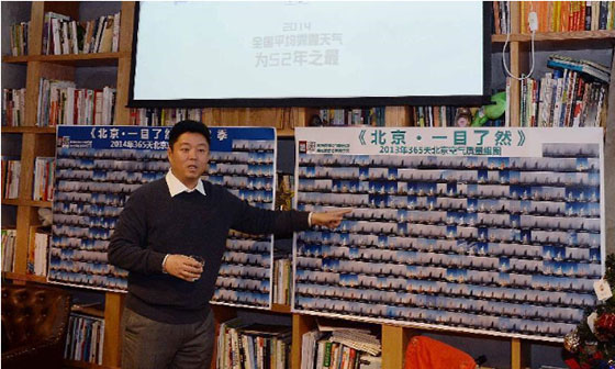 ??????? 這是鄒毅拍攝和拼版的2014年“一目了然”系列照片。鄒毅用2013、2014兩年時(shí)間,在同一地點(diǎn)、同一時(shí)刻用手機(jī)拍攝照片,記錄天氣變化狀況,并將兩年拍攝的700余張照片按年份匯總在一起,希望通過直觀的影像反映北京空氣質(zhì)量變化,讓更多的人關(guān)注霧霾、關(guān)注環(huán)境保護(hù)。本次分享會(huì)是他首次將兩年的拍攝成果一起集中展示。