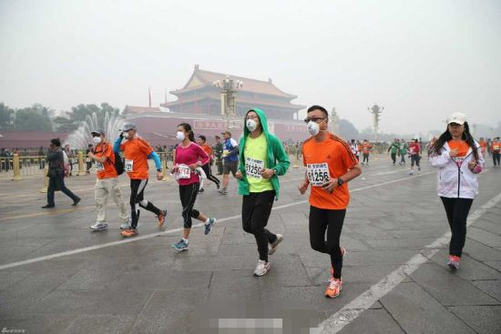 10月19日,2014年北京國際馬拉松賽如期舉行。霧霾再次襲來,當(dāng)天的PM2.5指數(shù)達300多,不少參賽者戴上了各式各樣的高倍防護口罩。“盡量用鼻子呼吸”的提醒、戴口罩跑馬拉松的反差,引發(fā)人們的深切思考。
