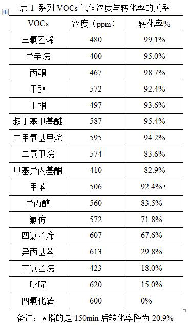系列VOCs在同樣檢測(cè)標(biāo)準(zhǔn)下(即催化劑自身的特性相同,包含同樣的二氧化鈦粒徑規(guī)格、晶相、比表面積等;檢測(cè)設(shè)備及檢測(cè)標(biāo)準(zhǔn)均相同,包含均應(yīng)用254nm的紫外燈管,一致的氣體流速、相對(duì)濕度、氧含量、30min后的穩(wěn)態(tài)檢測(cè)標(biāo)準(zhǔn)等)。狀態(tài)見表1: