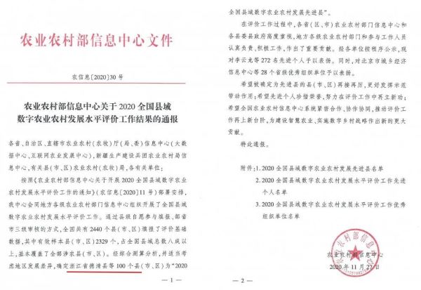 我國(guó)已持續(xù)多年開展縣域數(shù)字農(nóng)業(yè)農(nóng)村發(fā)展水平評(píng)價(jià)工作,這已經(jīng)成為推動(dòng)縣域數(shù)字農(nóng)業(yè)農(nóng)村發(fā)展的有力杠桿。2020年底,由農(nóng)業(yè)農(nóng)村部市場(chǎng)與信息化司會(huì)同農(nóng)業(yè)農(nóng)村部信息中心共同發(fā)布的《2020全國(guó)縣域數(shù)字農(nóng)業(yè)農(nóng)村發(fā)展水平評(píng)價(jià)報(bào)告》(以下簡(jiǎn)稱“報(bào)告”)顯示,2019年全國(guó)縣域數(shù)字農(nóng)業(yè)農(nóng)村發(fā)展總體水平達(dá)36.0%,較上年提升3個(gè)百分點(diǎn)。報(bào)告還確定德清縣等100個(gè)縣(市、區(qū))為“2020全國(guó)縣域數(shù)字農(nóng)業(yè)農(nóng)村發(fā)展先進(jìn)縣”,成為各地?cái)?shù)字鄉(xiāng)村建設(shè)的“風(fēng)向標(biāo)”。其中,德清縣在全國(guó)2400多個(gè)縣(市、區(qū))中以總分全國(guó)第一的成績(jī)脫穎而出,連續(xù)兩年獲此殊榮。