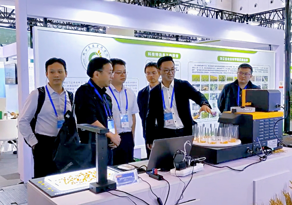 中國農(nóng)業(yè)科學院國家南繁研究院副院長周忠實(左三),中國農(nóng)業(yè)科學院國家南繁研究院部長虞國平(左二),中國農(nóng)業(yè)科學院國家南繁研究院數(shù)字化南繁基地創(chuàng)新團隊首席科學家張建華(左一)蒞臨托普云農(nóng)展位