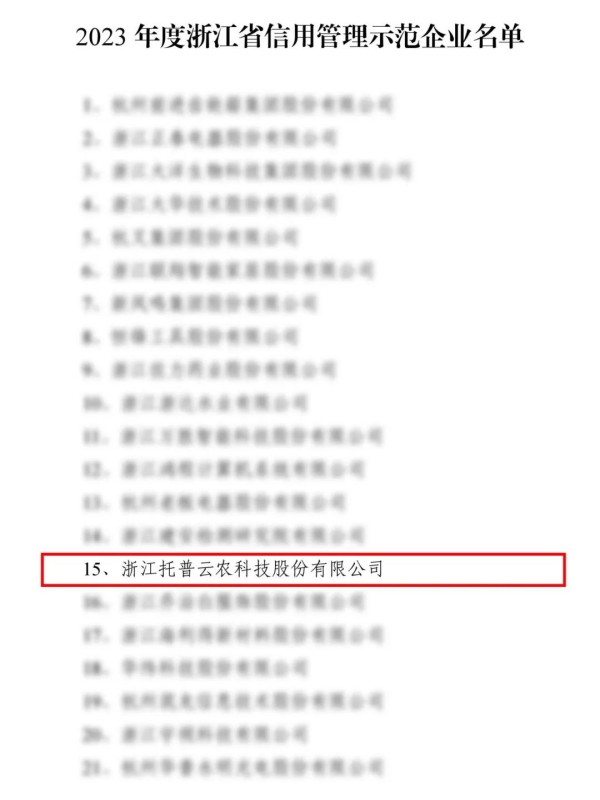 近日,浙江省市場監(jiān)督管理局公布《2023年度浙江省信用管理示范企業(yè)名單》,浙江托普云農(nóng)科技股份有限公司(以下簡稱“托普云農(nóng)”)榮譽入選。