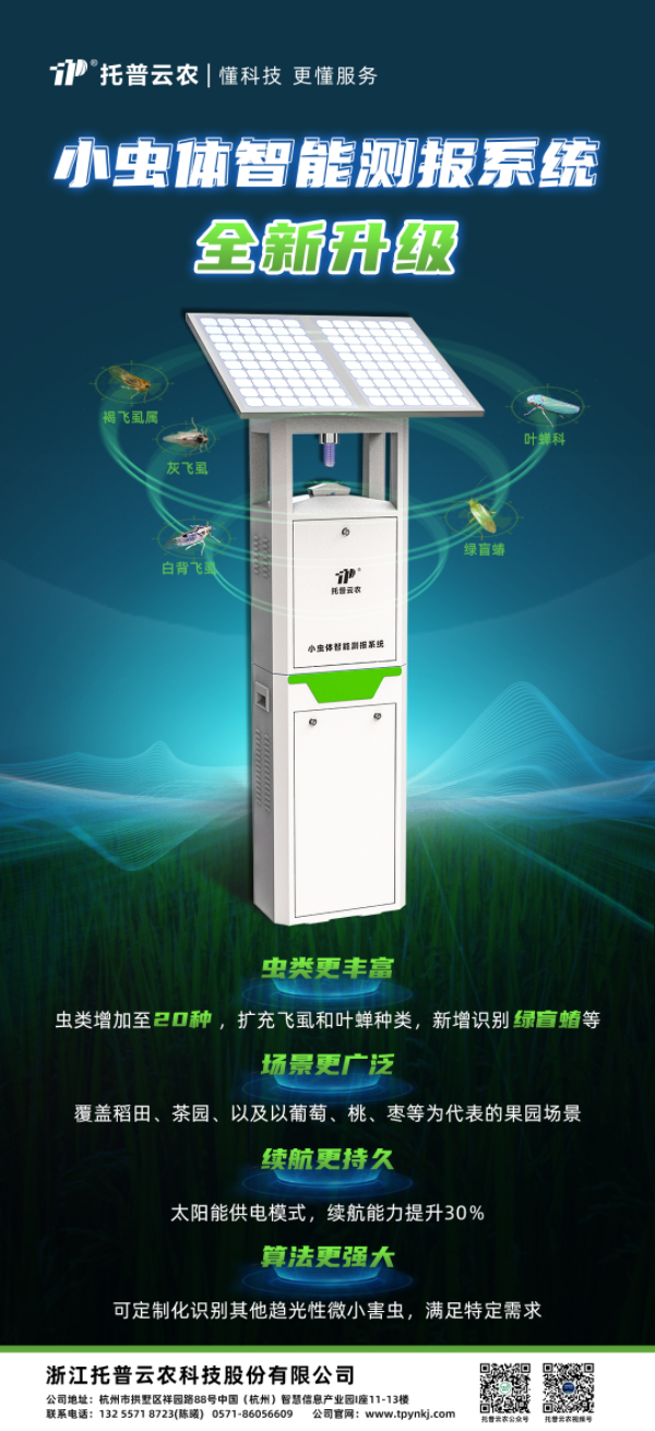 面對(duì)病蟲害肆虐的重發(fā)態(tài)勢(shì),托普云農(nóng)從解決市場(chǎng)痛點(diǎn)發(fā)力,在不斷取得階段性成效的同時(shí),進(jìn)一步夯實(shí)小蟲體智能測(cè)報(bào)系統(tǒng)的硬件基礎(chǔ),全面優(yōu)化軟件內(nèi)核。針對(duì)水稻、茶園、果園病蟲害防控的市場(chǎng)需求,對(duì)稻飛虱和葉蟬進(jìn)行了蟲類擴(kuò)充,新增了為害果園的綠盲蝽。同時(shí)突破了原有的識(shí)別能力和應(yīng)用場(chǎng)景,使小蟲體智能測(cè)報(bào)系統(tǒng)迎來新一輪的全面升級(jí),可識(shí)別蟲類擴(kuò)充至包括稻飛虱、綠盲蝽、葉蟬等20種毫米級(jí)微小蟲體。此外,托普云農(nóng)進(jìn)一步夯實(shí)硬件基礎(chǔ),采用太陽(yáng)能供電模式、防雨設(shè)計(jì),使續(xù)航能力有效提升30%,實(shí)現(xiàn)連續(xù)的陰雨天也可以正常捕蟲工作。