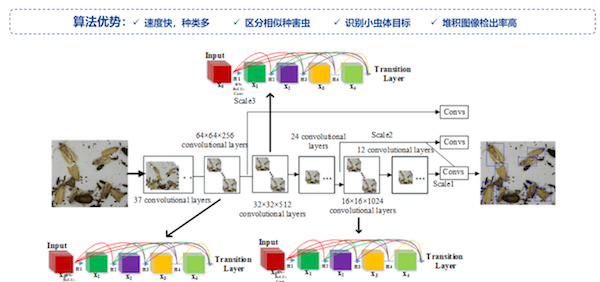 目前,托普云農(nóng)采用卷積神經(jīng)網(wǎng)絡(luò)深度學(xué)習(xí)的方法建立識(shí)別模型,已實(shí)現(xiàn)2063種農(nóng)業(yè)害蟲的智能識(shí)別。其中,二化螟、稻縱卷葉螟、玉米螟、棉鈴蟲、小菜蛾等國家一二類趨光性及主要農(nóng)林害蟲的識(shí)別準(zhǔn)確率達(dá)到97.5%;稻飛虱、葉蟬、綠盲蝽等毫米級(jí)小蟲體識(shí)別準(zhǔn)確率達(dá)90%以上。