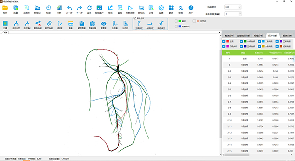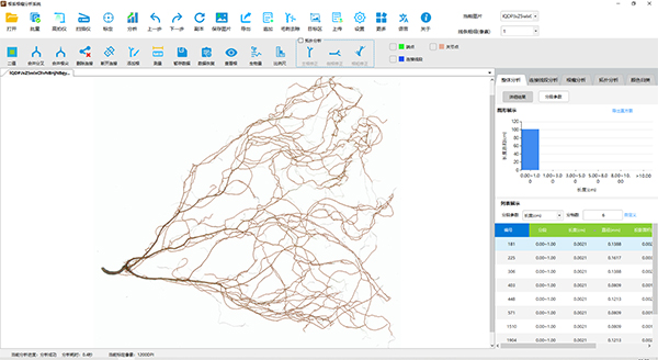 分段測量:通過直徑、投影面積、表面積、體積和長度進(jìn)行根系分段和分檔,自動測量各直徑段長度、投影面積、表面積、體積等,及其分布參數(shù),并輸出數(shù)據(jù)直方圖,實(shí)現(xiàn)數(shù)據(jù)可視化。