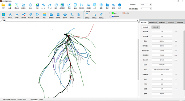 拓?fù)浞治觯?/strong>自動進(jìn)行根系拓?fù)浞治?,自動確定根的連接數(shù)、長度、體積等參數(shù),可自動區(qū)分側(cè)根等級自動分析主根或任意一支側(cè)根的參數(shù)等。