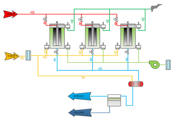 ??????? 由于從車間排放的有機廢氣是經(jīng)過渦輪膨脹機組排出,所以排出的廢氣首先經(jīng)過粗效過濾器過濾廢氣中的粉塵或雜質,然后直接進入到活性炭纖維吸附裝置進行有機廢氣吸附,經(jīng)過吸附后的廢氣可以直接達標排放;吸附飽和后的活性炭纖維經(jīng)水蒸氣脫附并且冷凝后,回收的有機溶劑可以循環(huán)再利用,廢水則進行集中處理后排放。