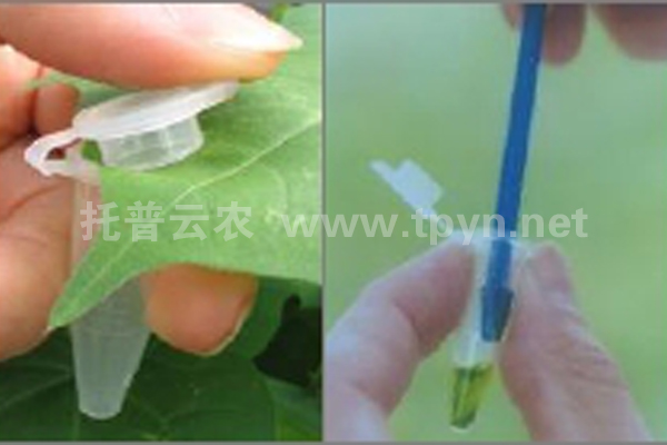 1、將植物葉片組織置于一次性組織提取管的蓋子與管身之間,迅速蓋住蓋子,重復 2 次,得到 2 片圓形葉片組織。用杵將葉片置于提取管的底部。用記號筆在管壁做好標記。