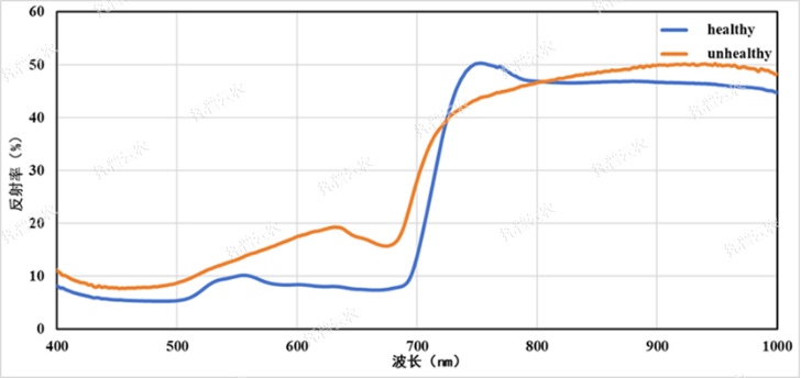 7.病蟲害分析:可適用于植物病蟲害試驗(yàn),進(jìn)行病斑部分和健康部分光譜反射曲線進(jìn)行對(duì)比,通過對(duì)變化趨勢(shì)的研究可以對(duì)病害發(fā)生部分和嚴(yán)重程度進(jìn)行分析;