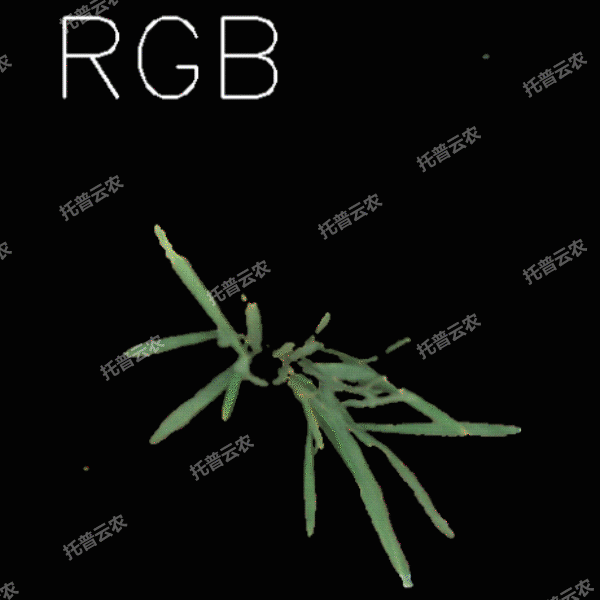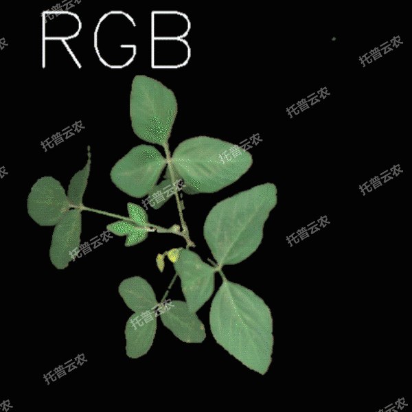 可見光二維成像單元:獲取植株側(cè)視可見光圖像,并利用人工智能算法分析獲取株高、葉頂點(diǎn)數(shù)、投影面積等形態(tài)參數(shù),黃色投影面積、綠色投影面積等顏色參數(shù),以及平滑度等紋理參數(shù),用于植株株型與健康狀態(tài)相關(guān)表型分析。